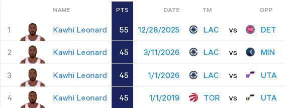 本场比赛已经是莱昂纳德在本赛季第五次单场得分达到40分以上,而在他此前的职业生涯中,单赛季40+次数还从未超过两次。另外,45分的单场得分也追平了莱昂纳德生涯的第二高分,仅次于本赛季对阵活塞时得到的55分。翻开莱昂纳德的生涯单场得分榜,排在前四的四场比赛,有三场都是在2025-26赛季发生。回想起2019年夺冠的生涯巅峰,莱昂纳德的这一数据统计相当反直觉。