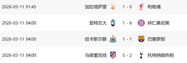 北京时间3月11日,欧冠淘汰赛首回合比赛,拜仁、马竞、利物浦和巴萨等豪门出战,结果拜仁和马竞分别大胜对手,而利物浦和巴萨则都没能取胜,下周中能否晋级还有悬念。